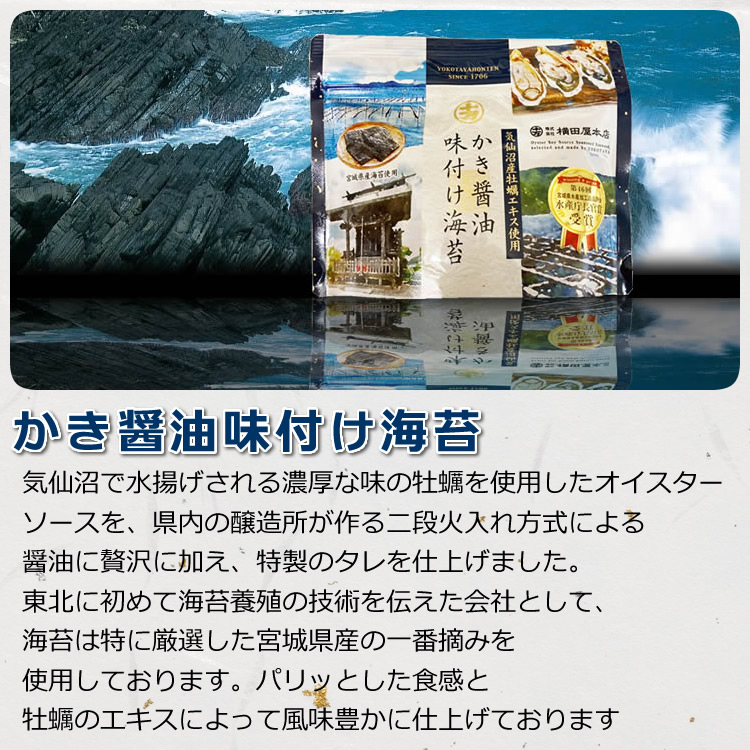 東北に初めて海苔養殖の技術を伝えた会社として、海苔は特に厳選した宮城県産の一番摘みを使用しております。パリッとした食感と牡蠣のエキスによって風味豊かに仕上げております。